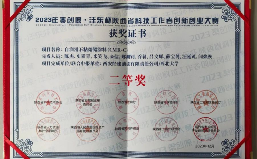 本次省內各大高校及相關科技企業的參賽項目共661個,其中75個項目晉級決賽。陜西寶塔山油漆股份有限公司技術總監陳杰博士帶領的功能涂料團隊聯合西北大學化學與材料科學學院史素青教授課題組共同研發的“自潤滑不粘熔鋁涂料(CMR-C)”項目經過預賽的角逐后晉級決賽,并獲得2023秦創原“灃東杯”陜西省科技工作者創新創業大賽優秀成果二等獎。